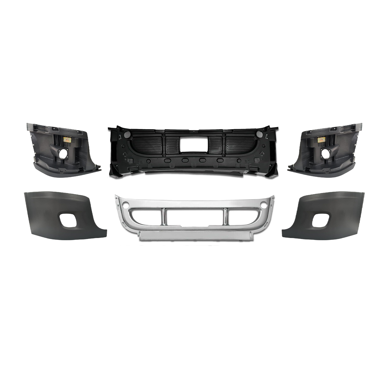 - Complete Front Bumper Assembly with Center Chrome trim and Fog Lamp Hole for Freightliner Cascadia 2008-2017